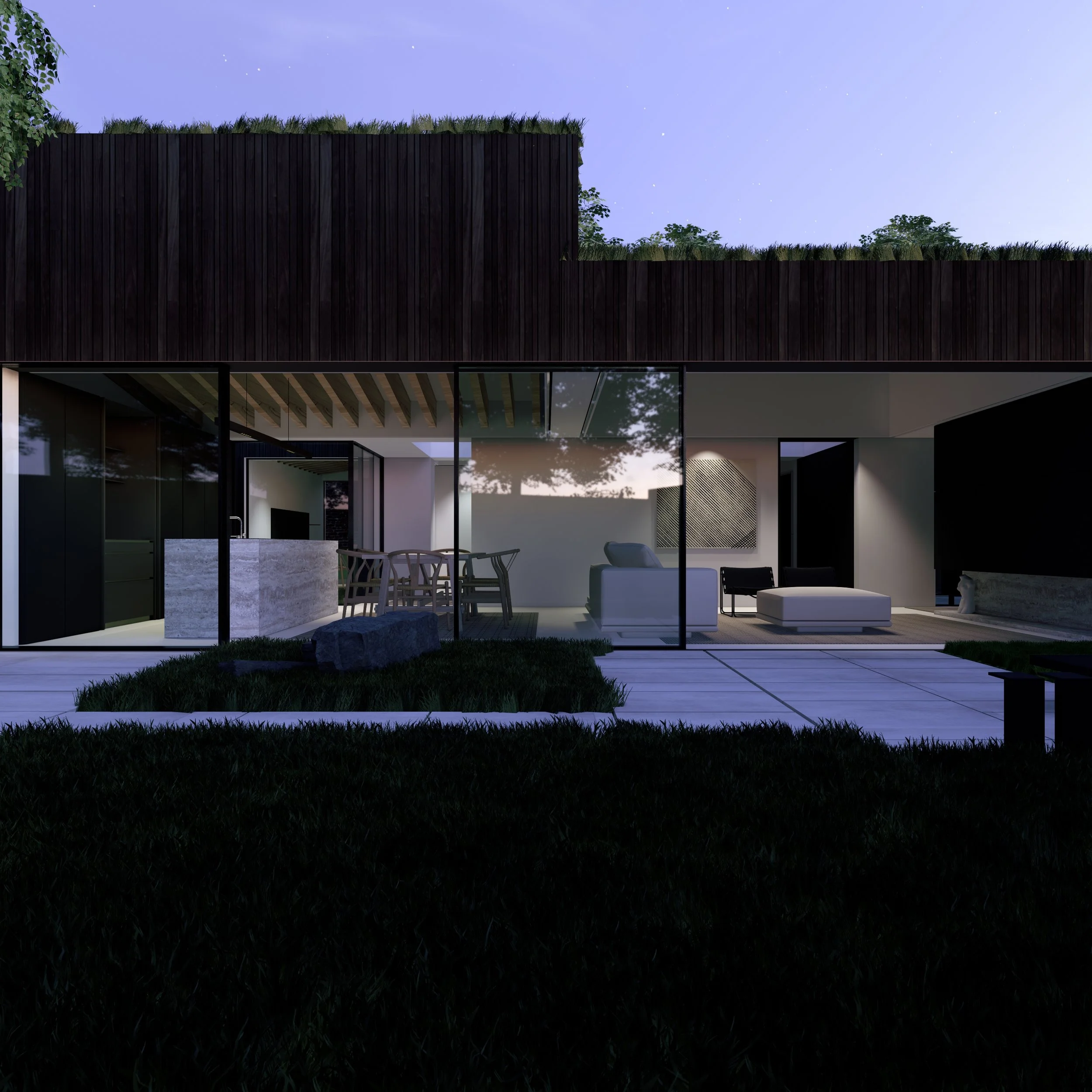 Our solution was to design a home where every view from every window is carefully controlled through precise orientation. This approach allows for private and intimate views of the surrounding gardens without compromising natural daylight. The result is a house completely enveloped by greenery, where every window frames a curated view of beautiful trees and planting.