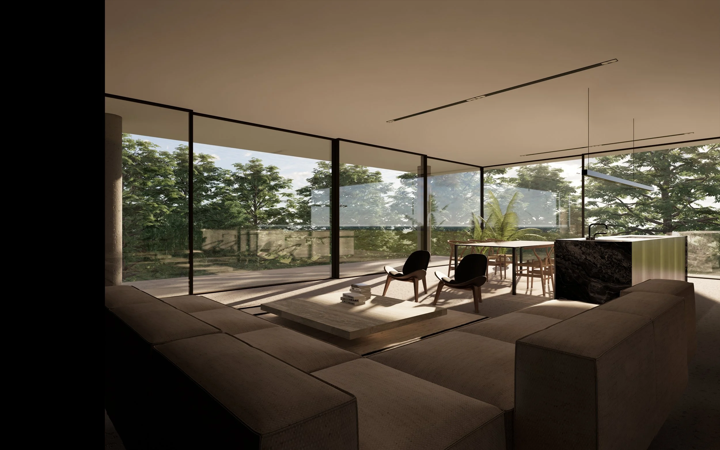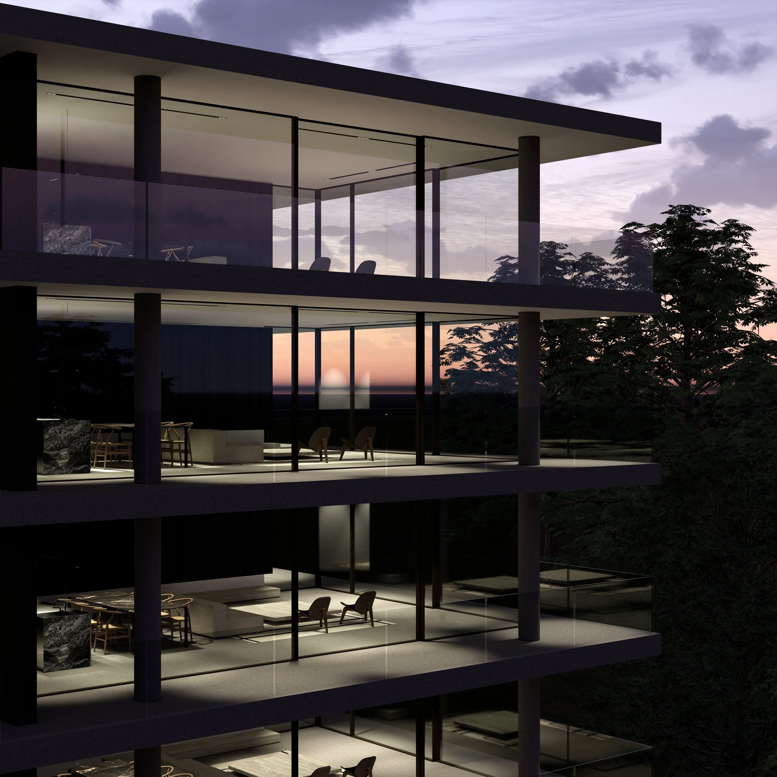 This design enables the spaces to open in multiple directions, with full-height glazed façades on all sides, creating a seamless connection with the surroundings.