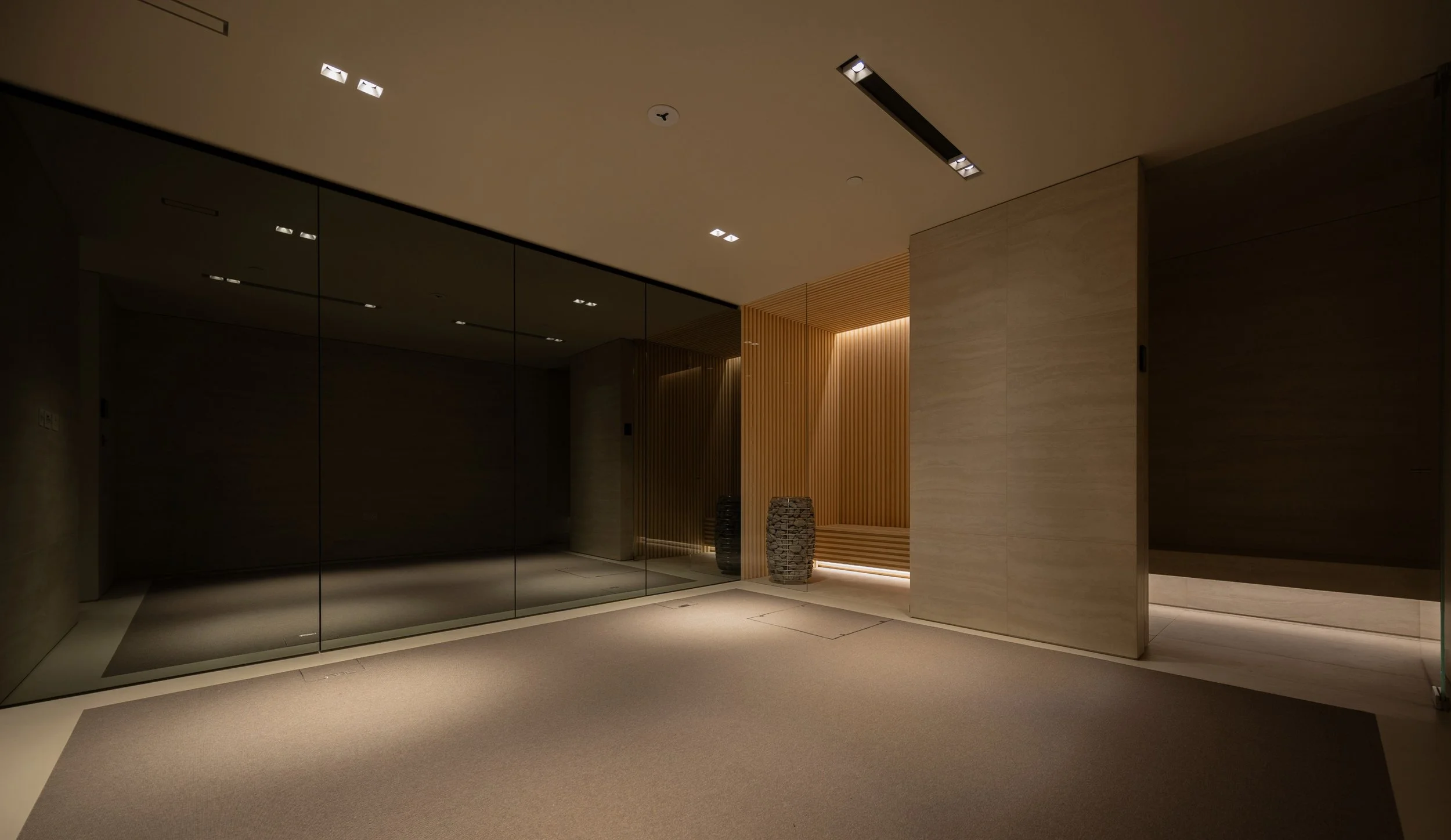 The project includes a wellness area featuring a bespoke sauna, a steam room, and a dedicated space for sports equipment. A warm, inviting material palette has been carefully chosen to enhance the overall atmosphere