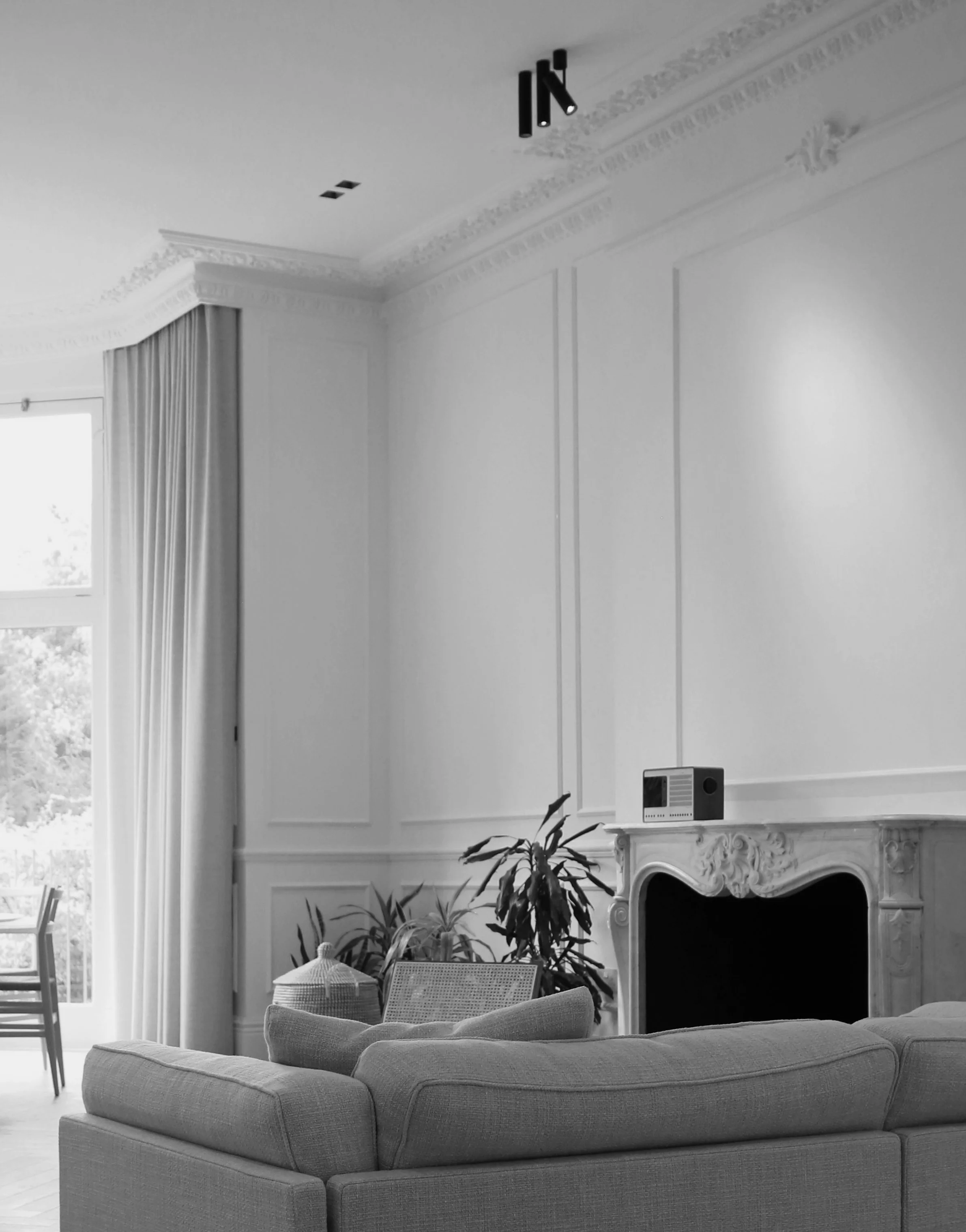 A reclaimed French fireplace, chosen for its period authenticity, adds an international touch, complemented by carefully selected furnishings including a sofa designed by Piero Lissoni.