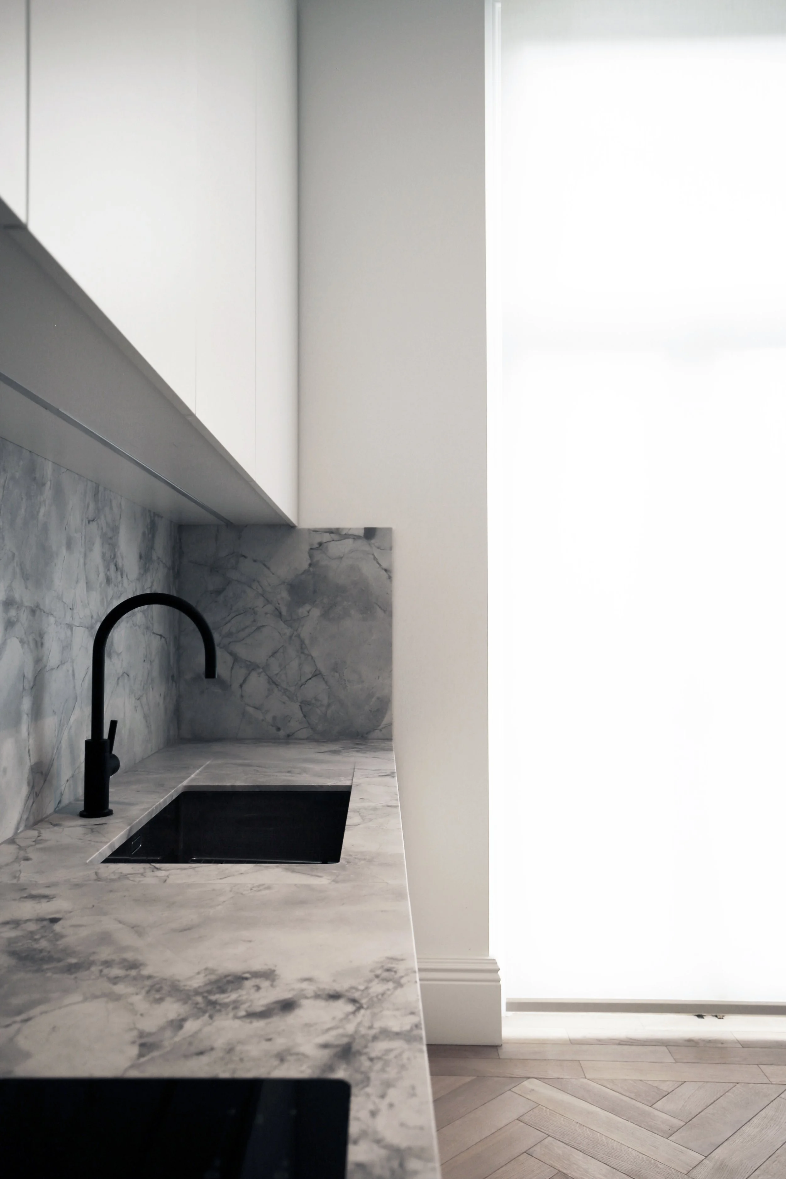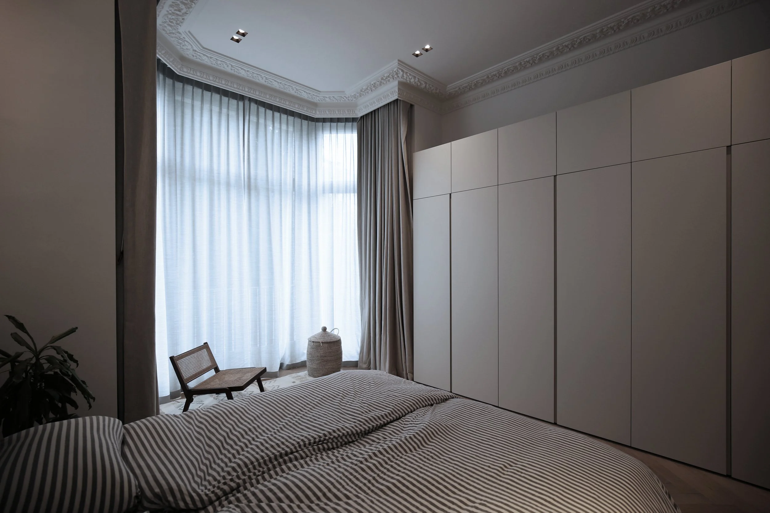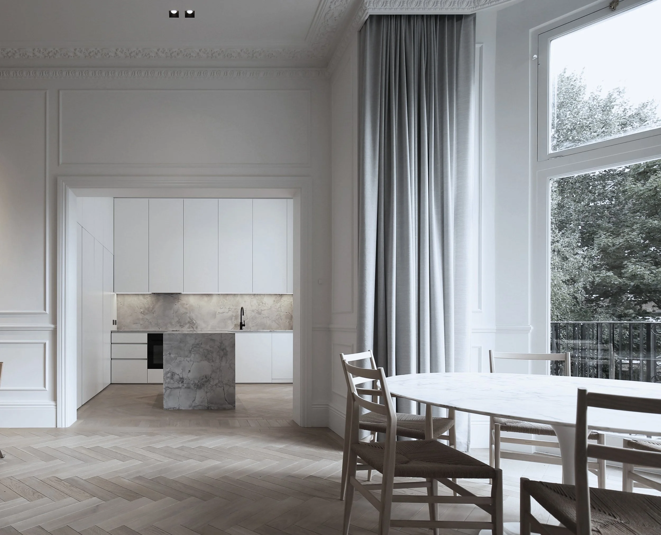 The Ormonde Court project is a meticulous restoration and redesign of a first-floor apartment located in a Victorian white stucco building in Belsize Park, London. Initially poorly configured and stripped of its original charm due to years of neglect and misguided refurbishment, the apartment's main living and dining area once exuded grandeur typical of its Victorian heritage.