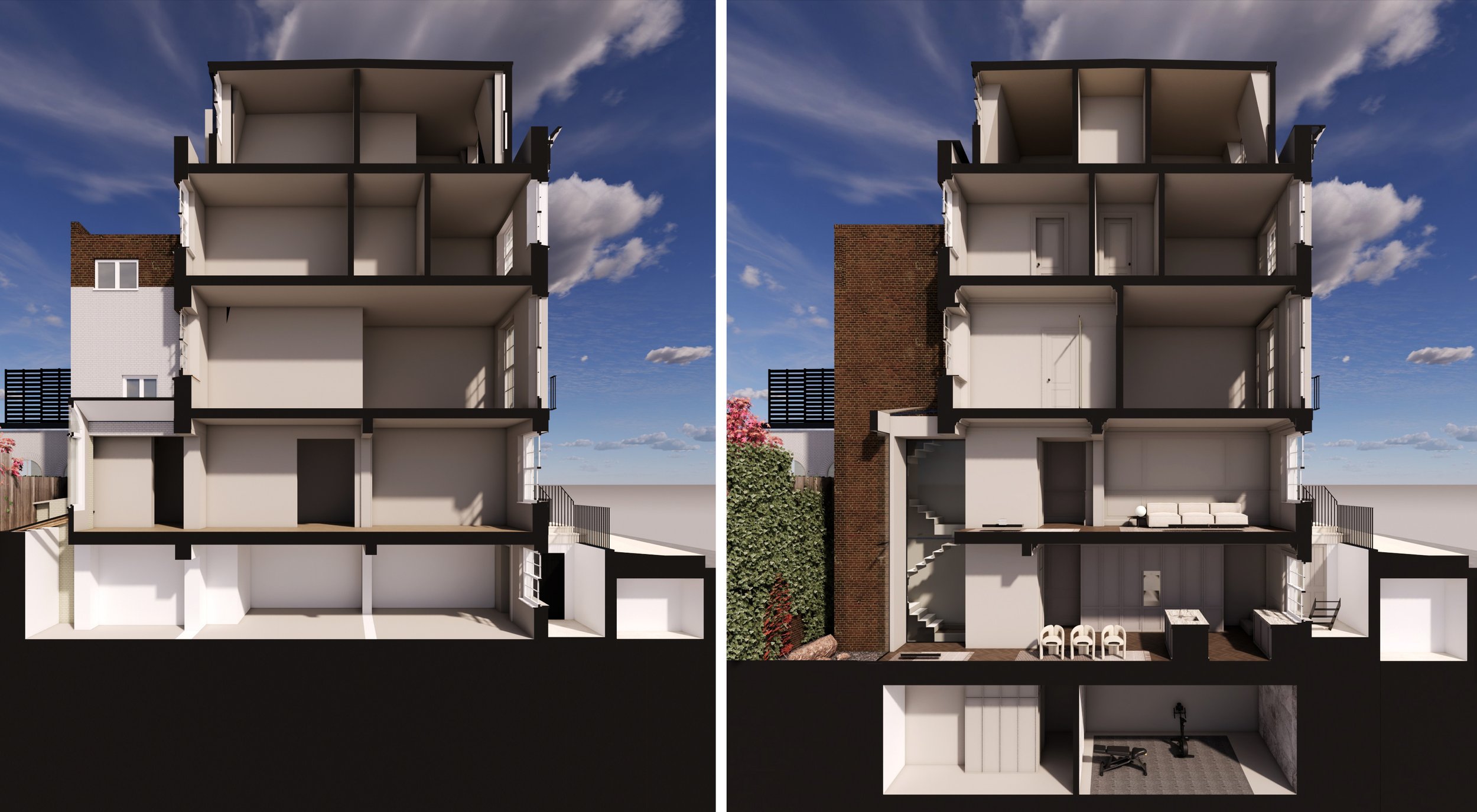 The client approached us to prepare a feasibility study to analyse and identify the most optimised layout and potential extensions for the property, with the aim of increasing the internal area while maintaining a high quality of space. A key objective of the study was to balance spatial efficiency with daylight, proportions, and overall liveability.